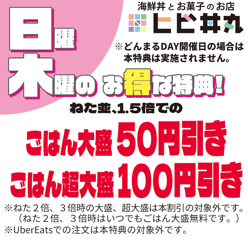 ■木曜日曜はねた並、1.5倍の『ごはん大盛50円引き』■